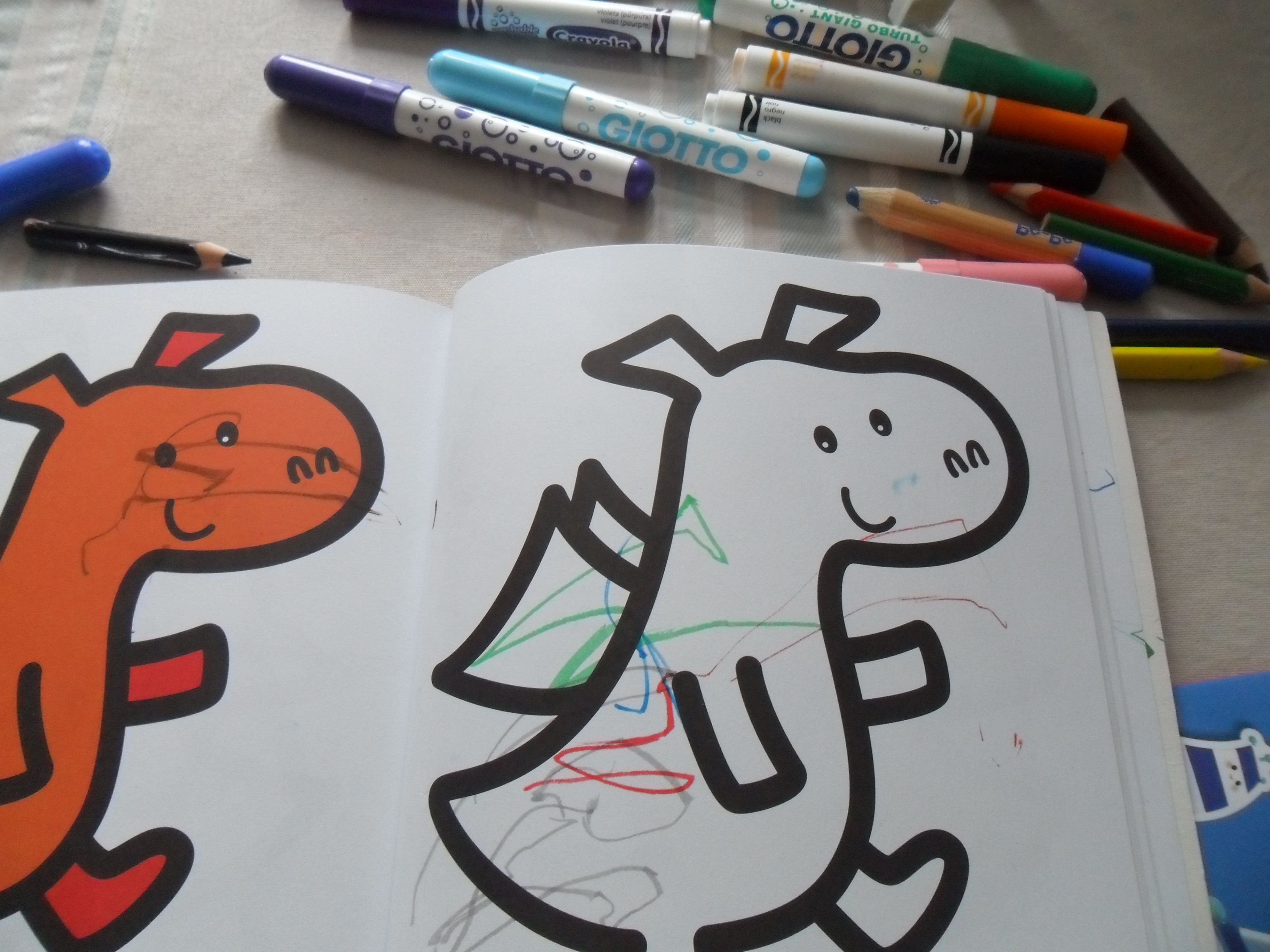 Comme Chipounette me voit ecrire et regarde avec envie mon stylo, je lui propose un atelier coloriage. D'habitude elle apprecie, mais aujourd'hui, elle avait surtout envie de deboucher et de refermer les feutres, si bien que le dessin n'est pas trop colore au final. Tant pis, elle le continuera une autre fois. Elle s'est bien amusee pourtant, ca se voit au niveau de ses mains, de son visage et meme de son pull ! Ouf, heureusement ce sont des feutres lavables a l'eau !